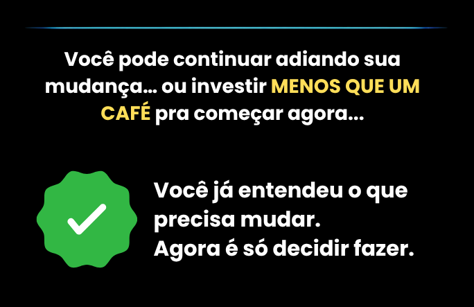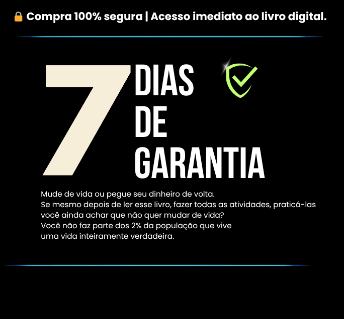 Sem problema. Você tem 7 dias de garantia total. Se o conteúdo não fizer sentido pra você, eu devolvo 100% do valor — sem perguntas.