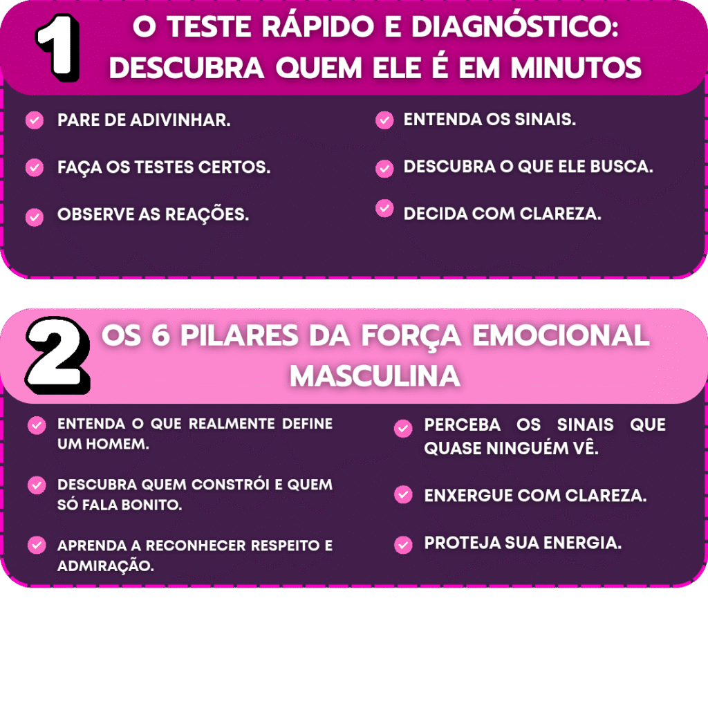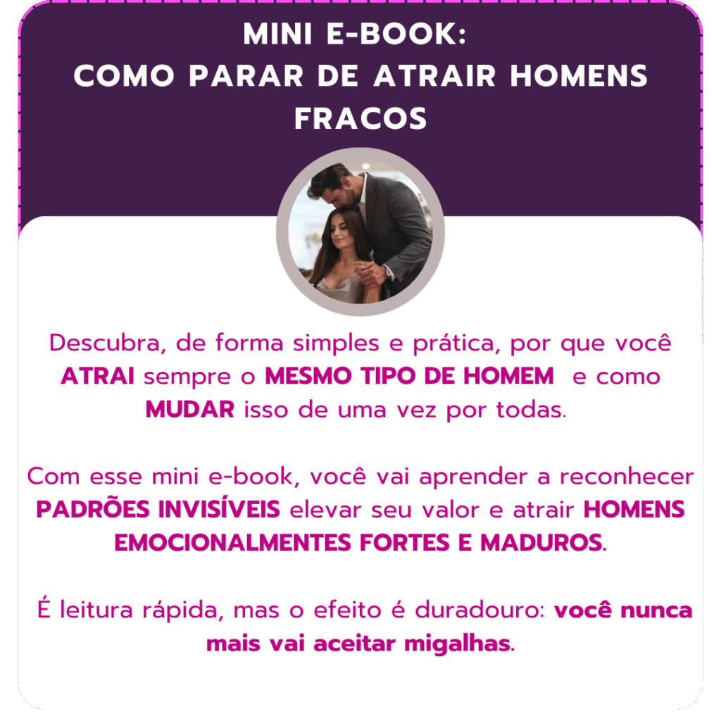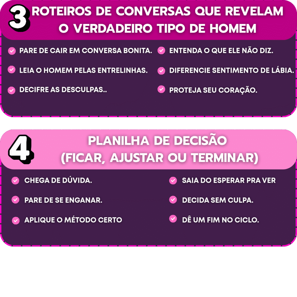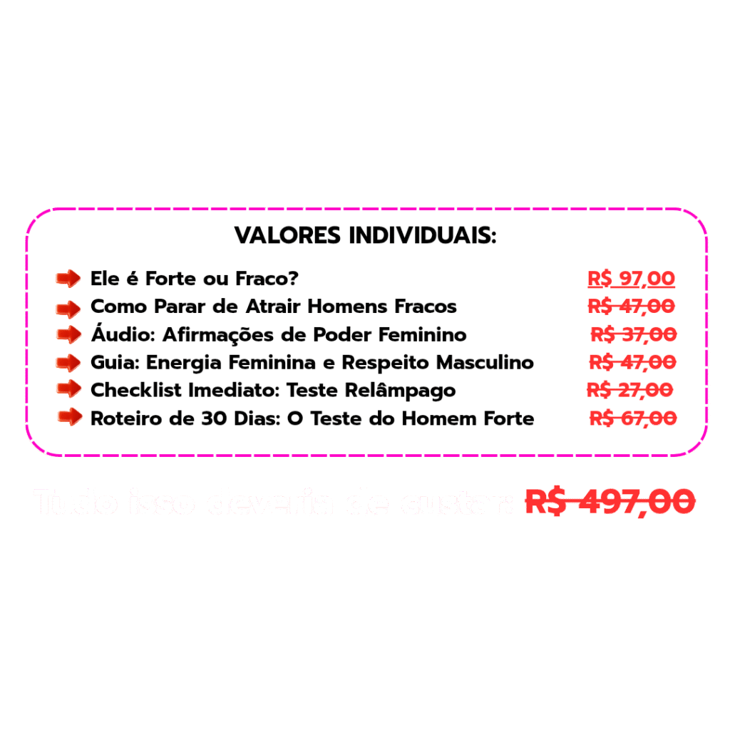 Você vai aprender a identificar se o homem é forte ou fraco, entender seus sinais, atitudes e reações e principalmente, como se posicionar pra ser respeitada e valorizada.