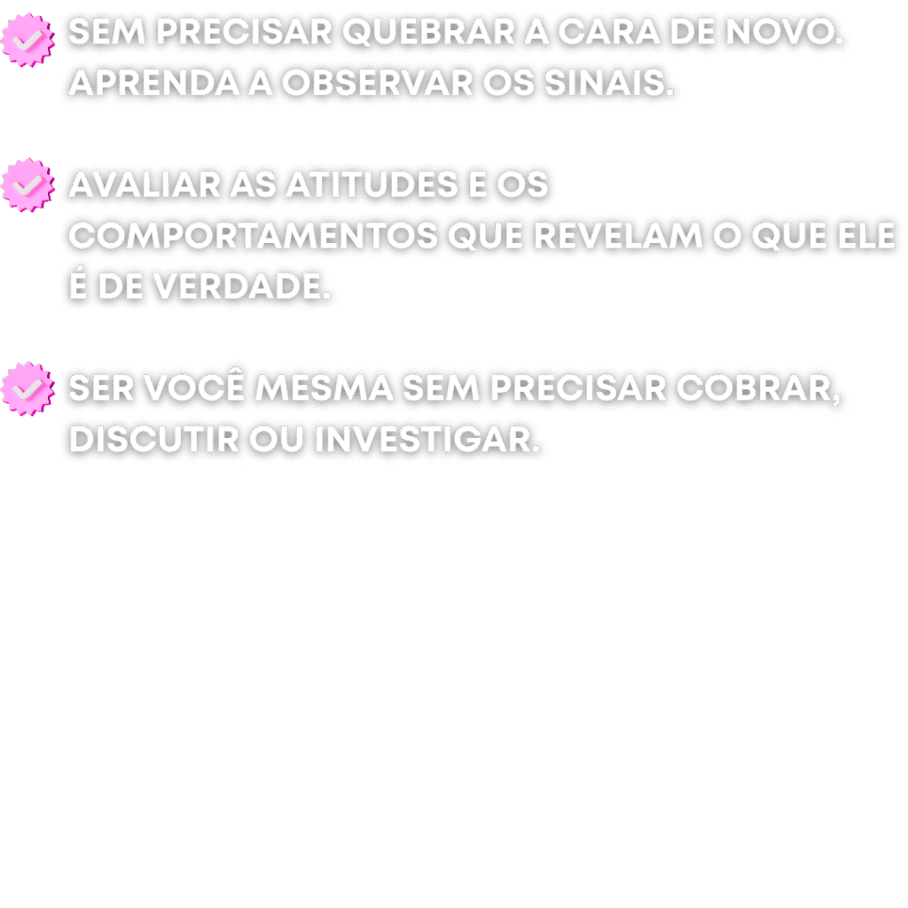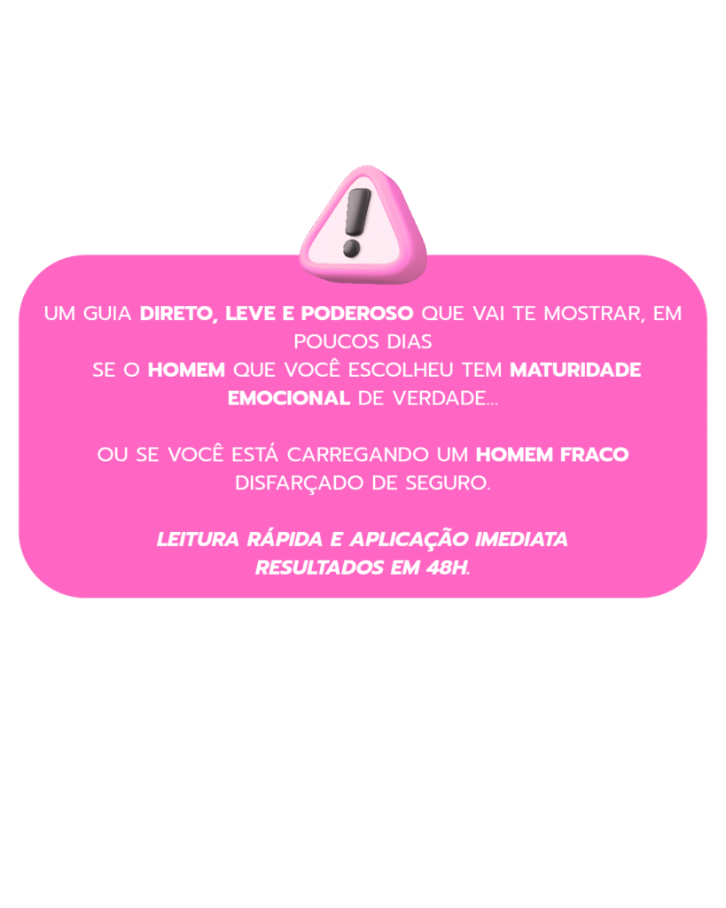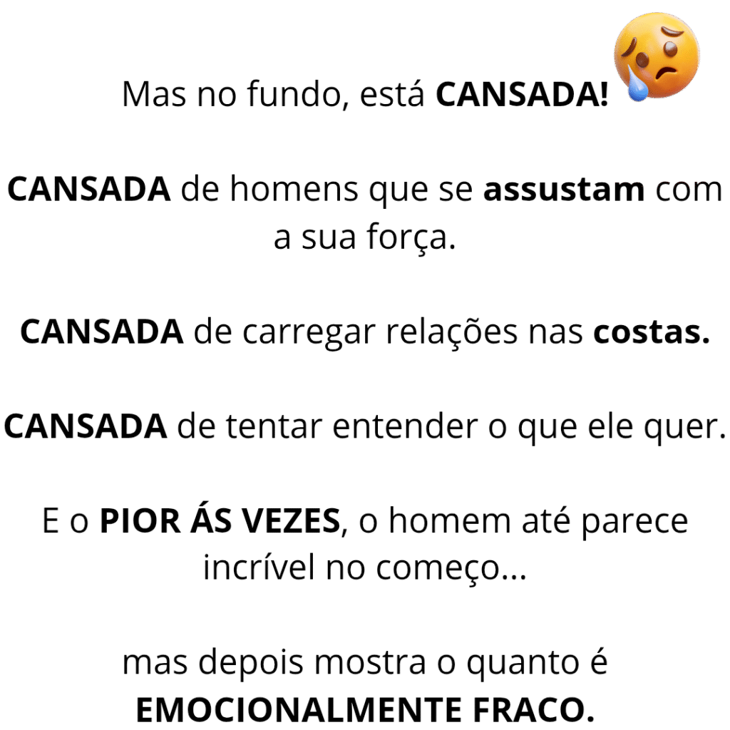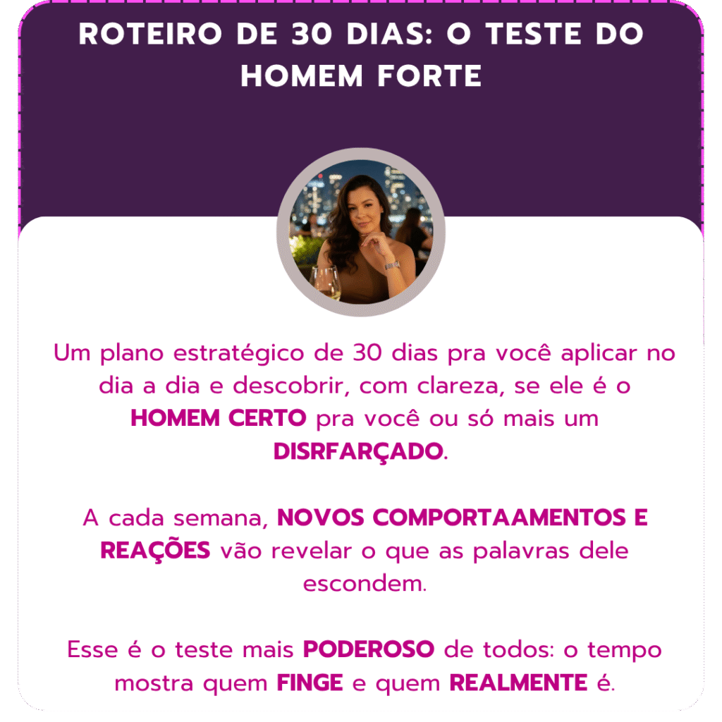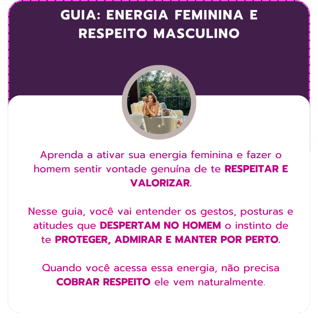 Você vai aprender a identificar se o homem é forte ou fraco, entender seus sinais, atitudes e reações e principalmente, como se posicionar pra ser respeitada e valorizada.